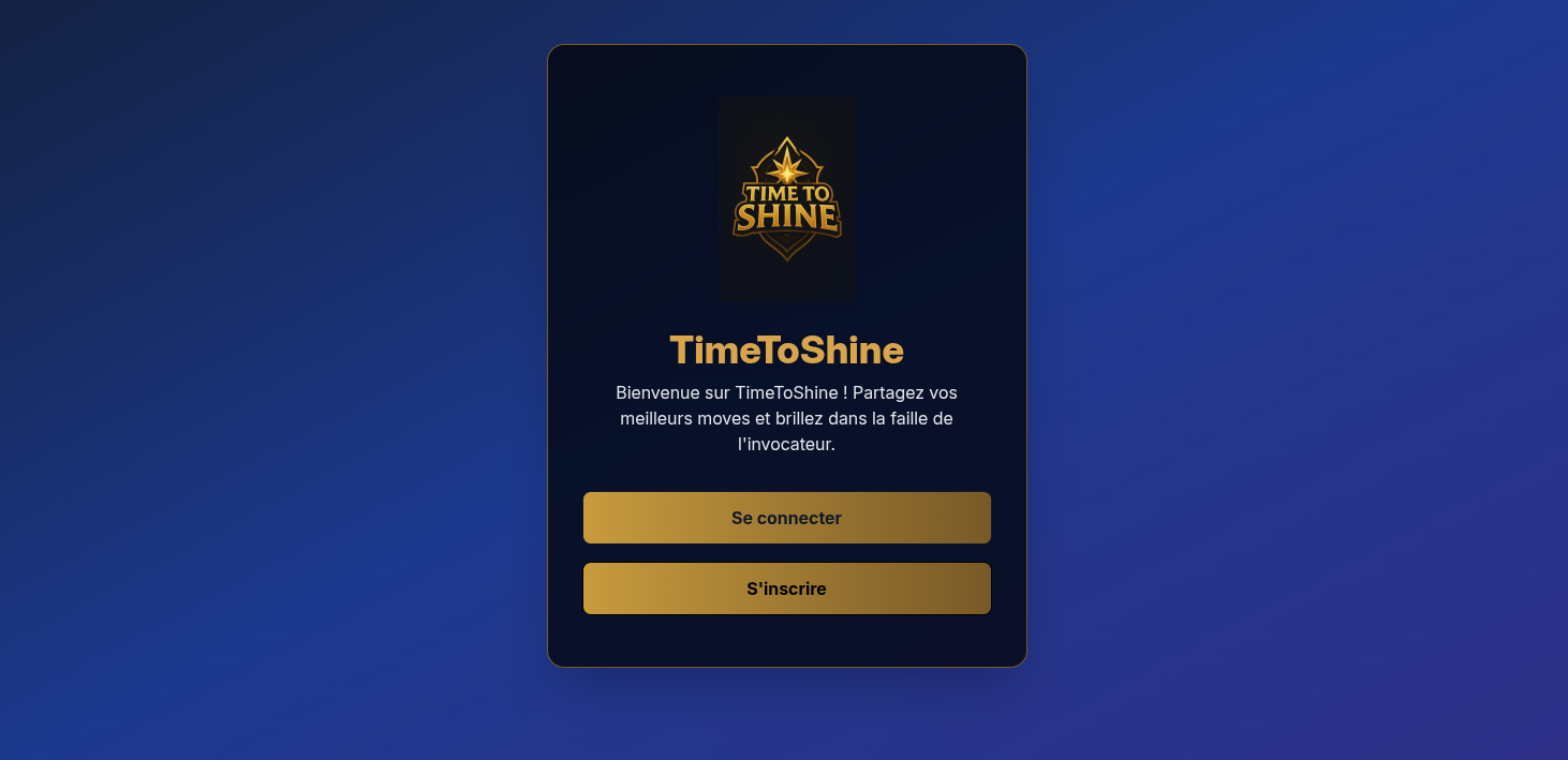 TimeToShine est une plateforme sociale, collaborative et communautaire, conçue pour célébrer et partager les moments les plus marquants des joueurs sur la Faille de l’invocateur. Elle permet aux utilisateurs de téléverser leurs enregistrements d’actions remarquables (« best moves »), de mettre en avant leurs compétences et d’interagir avec la communauté.